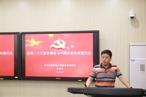 经管学院院长夏显力教授、教务处李论副处长作为特邀嘉宾出席活动并分别作专题报告。夏显力教授以《党的二十大报告解读与中国农业农村现代化》为题,从党的二十大概况、农业农村现代化是中国式现代化的重要组成部分、深刻理解和把握农业农村现代化的丰富内涵、加快推进农业农村现代化的基本方略四个方面,生动阐述了农业现代化是中国式现代化的重要组成部分,也是建设农业强国的必要条件。他强调,实现中国农业农村现代化,不仅需要亿万农民的辛勤耕耘,也需要全社会的积极参与,中国的发展实际不允许我们照搬照抄其他国家的经验做法,而是要走“大国小农”背景下的中国式农业农村现代化之路,这是建设我国农业农村现代化的必然选择。
