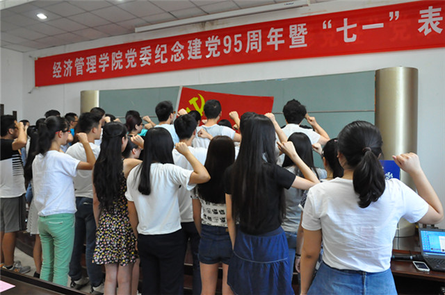 会议在激昂雄壮的国歌声中拉开帷幕。院党委委员王秀娟宣读了《关于对各党支部把上报2016年上半年新吸收预备党员及预备期满党员转正情况讨论结果的批复》文件,确定了新吸收预备党员及转正预备党员名单。姚晓霞随后带领新老党员及预备党员面向党旗宣誓,庄严肃穆的宣誓声中,全体参会党员重温入党誓词,进一步坚定理想信念。王秀娟宣读了《经管学院党委关于表彰先进基层党组织、优秀共产党员、优秀党务工作者的决定》,党委党员分别为先进党支部、优秀党务工作者、优秀共产党员颁发荣誉证书并合影留念。