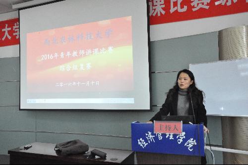 11月10日下午14:30,在经管学院603报告厅,西北农林科技大学青年教师讲课综合组复赛现场教学隆重举行。经过预赛,来自经管学院、人文学院、马克思主义学院、外语系、体育部的15名选手脱颖而出,站在了复赛的讲台上。本次复赛,经管学院、理学院、人文学院、马克思主义学院、外语系、体育部6个学院合计18名专家担任评委,经管学院学工办卢玮楠担任主持人,相关学院80名师生到场助阵。