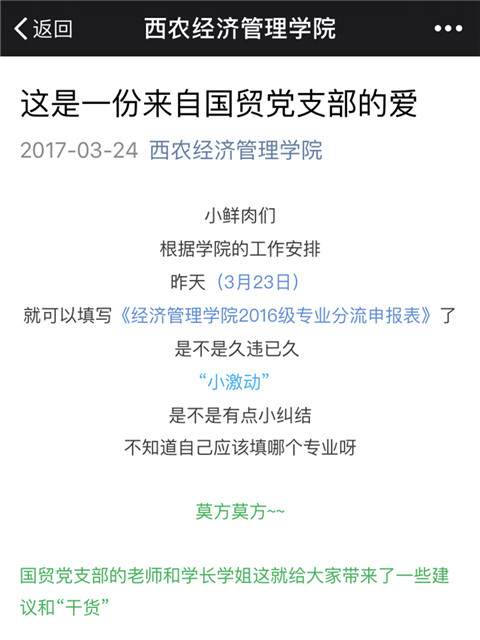 国贸支部全体党员积极行动,首先总结了2010-2017届国贸专业同学毕业流向,重点汇总了保研、考研、出国、考公务、仅金融机构及进我国百强企业的同学名单目录。其次,通过多种途径将信息传播出去。如在学院学工办的热情支持下利用“西农德赢AC米兰”微信公众平台推送“这是一份来自国贸党支部的爱”,阅读量达1000;利用微信圈子转发、制作《这是一份来自国贸党支部的爱》宣传手册等等。第三,联系已毕业及在校国贸优秀学子做主题报告或面对面交流。如优秀在读博士生侯建昀、硕士生黄腾、2013级就业达人裴玉璘、保研达人张馨月、张鹏飞以及2014级全面发展的张安琪、张怡萍、吴鑫桐等。大家以自己的亲身经历现身说法,为各位学弟学妹们展现了一个又一个鲜活的例子,也让学弟学妹们对于国贸专业有了一个全新的认识,侯建昀学长情真意切的演讲更是让大家对未来在国贸专业的学习与成长有了新的希望。我们不仅向学弟学妹们介绍了国贸专业的基本概况、发展方向、课程内容以及师资力量,而且提问环节对学弟学妹们提出的问题、疑惑进行了耐心的解答。