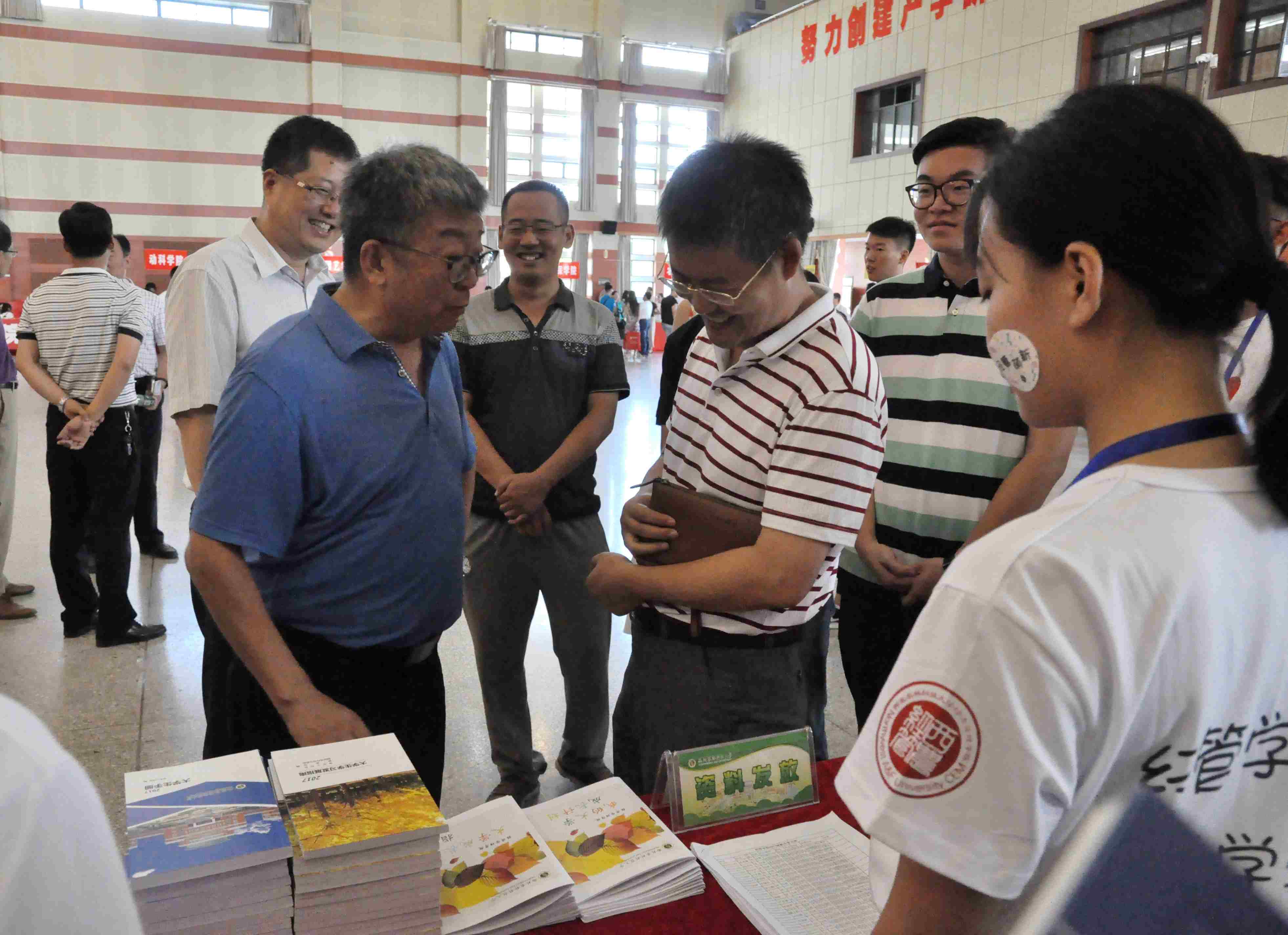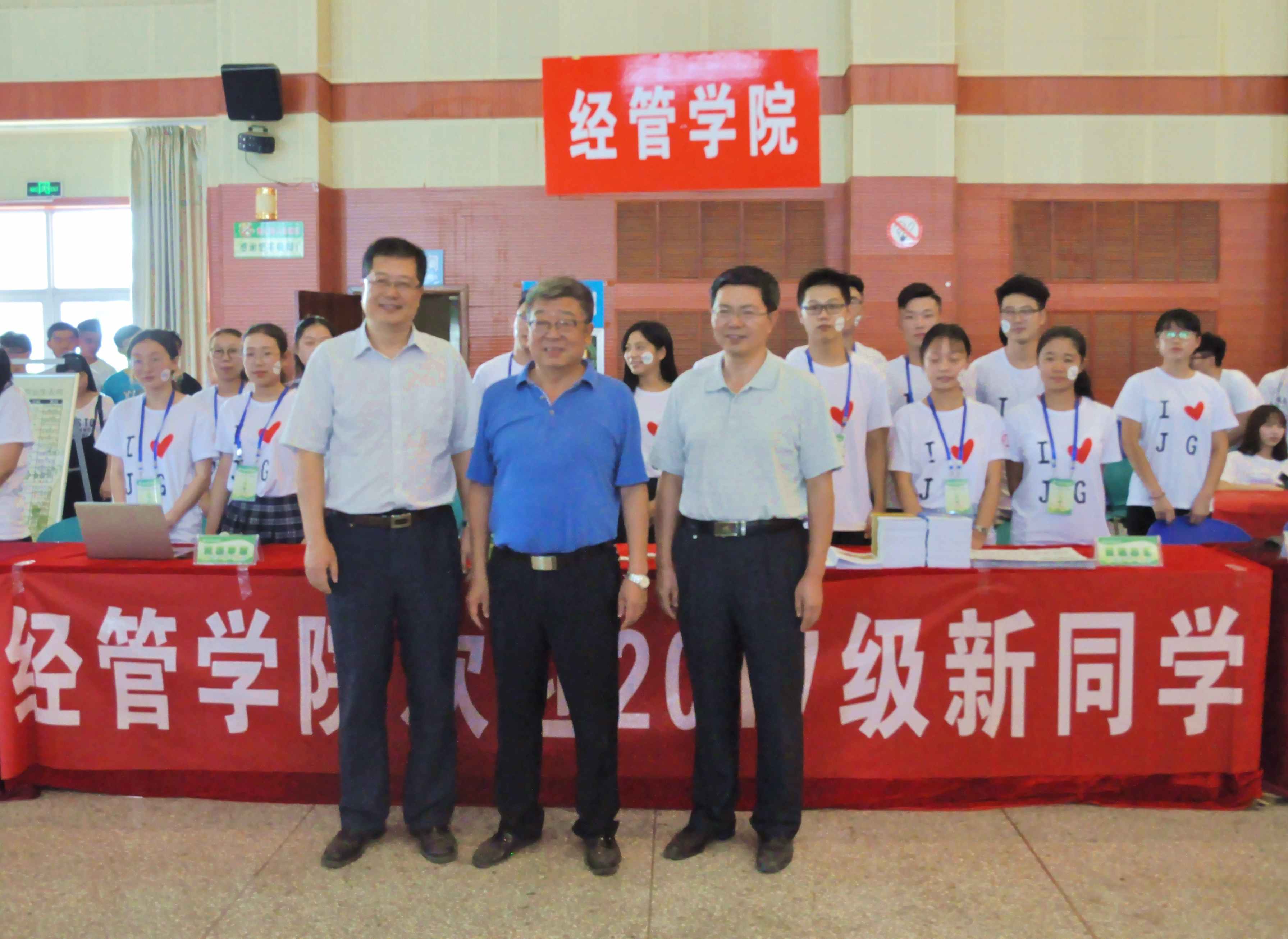 德赢官网负责迎新工作的学生干部们统一着装印有“我爱经管”字体的T恤,脸上贴着由学生自己设计的印有“经管萌新”图案的贴纸,认真细致,朝气蓬勃的进行着准备工作,现场井井有条。吴普特行至经管学院报到区域前,充分肯定了经管学院迎新准备工作的高效、认真,饶有兴趣地翻阅了学工干部为新生和家长们准备的《大学生成长手册》及《成长手册》家长版后对此项工作表示认可。同时,希望迎新的学生干部们能以饱满的热情保证迎新工作圆满进行。吴普特还指出,经管学院是学校人数最多的学院,工作量大,任务繁重,更需要大家打起精神,精诚团结。视察后,校领导与德赢官网团学干部合影留念。