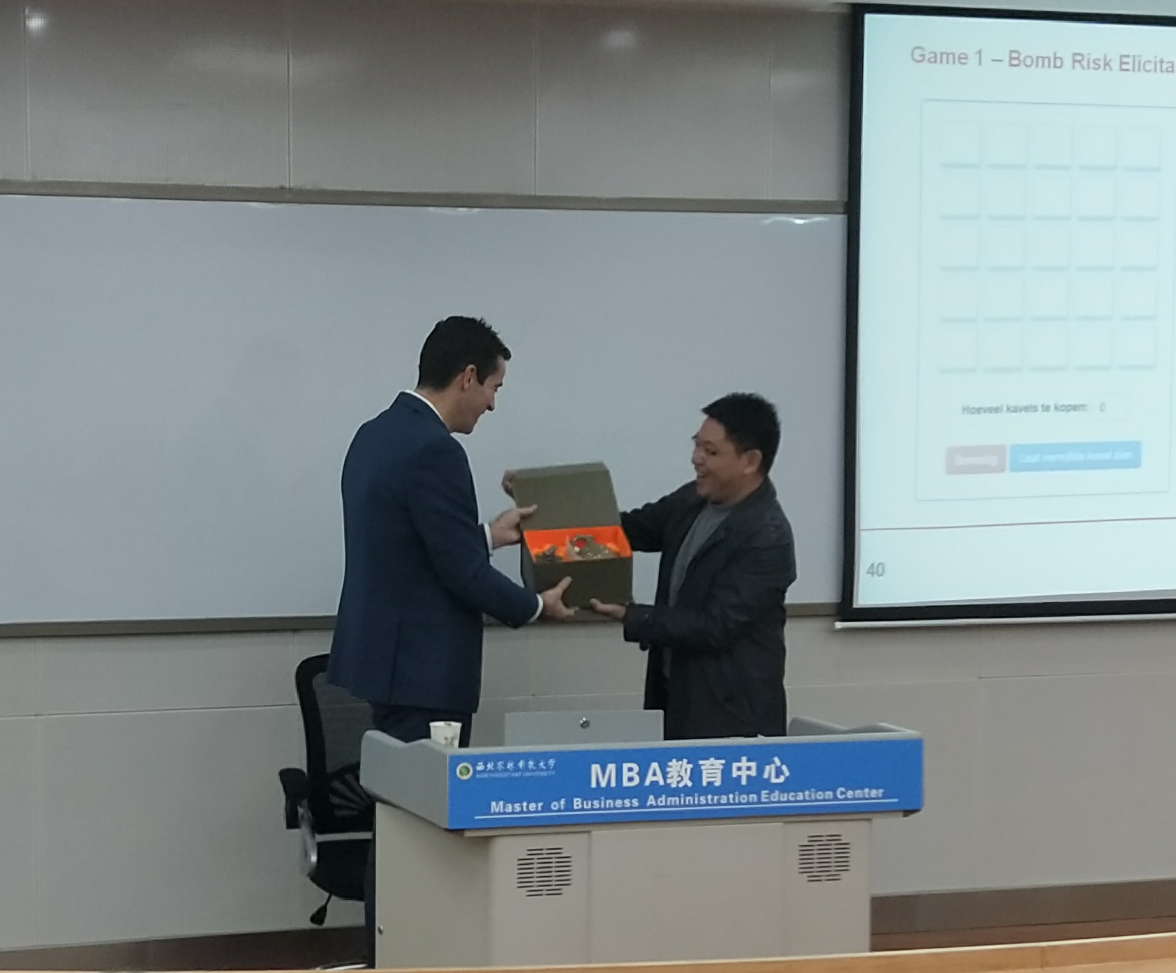 聆听报告的师生热情很高,其中李可阳博士作为Erwin van der Krabben教授的学生也进行了精彩的发言。随后,夏显力教授赠送给Erwin van der Krabben教授具有中国特色文化的一套陶瓷礼品,交流结束后,不少师生意犹未尽,纷纷走上讲台与Erwin van der Krabben教授交流。