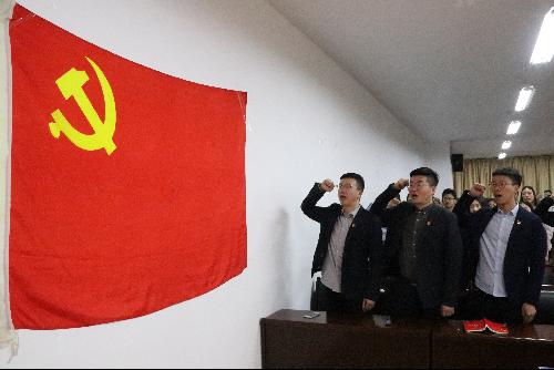 温晓林为全体辅导员、全体学生党支部书记佩戴党徽,带领大家面对党旗,高举右拳庄严重温入党誓词。典礼就此落下帷幕。