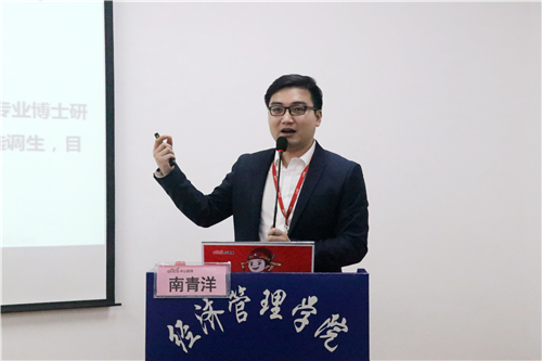 讲座伊始,南青洋通过介绍考取选调生的优势、发展前景等来激发学生的兴趣与热情,在场同学深受鼓舞,现场氛围十分活跃。接着,他从选调生的招录流程、分配原则、分配方向、发展方向以及岗位优势等方面进行由点及面、层层递进的系统介绍与指导。在岗位优势方面,他特别强调,选调生的岗位竞争比在10:1以下,而考研的岗位竞争比为50:1,从而说明选调生的考试压力较小,成功机会较大。随后,南青洋针对选调生考试的两个科目——行测和申论的内容板块进行详细讲解,他认为,申论旨在考察考生“办文、办公、办事”的基本能力和素养,考生应在分析给定资料的基础上抓住“政府的方针政策”、“关注群众的利益诉求”等要点。他强调申论的核心是材料的阅读能力,并从关键词阅读以及核心句阅读两个方面提供了申论作答的方法与技巧。对于文章写作方面,他通过对文章结构与写作进行层层剖析,充分分析了学生在写作中遇到的困难与障碍。最后,在答题的细节处理上,南青洋做出以下几点建议:第一,分条作答,标明序号;第二:抓住材料关键字、条理清晰;第三:吃透摸清历年真题,提高自己答案的规范程度;第四:关注人民日报、新华网等主流媒体的相关报道及评论,通过科技手段提高自己的备考效率。