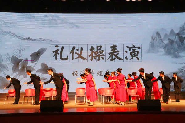 本次大赛历时一个月,共有8个学院进入决赛环节。决赛由礼仪操表演和创意展示两部分组成,第一轮比赛为各参赛院系进行礼仪操表演,参演学生25人,辅导员1人。尽显绅士风度的正装,端庄典雅的的红旗袍,无不彰显着经管学子积极向上、风度翩翩的精神面貌。引领、问好、握手,每一个动作,尽显礼仪风貌,引领时身体微微弯曲侧倾,手臂轻轻贴于体侧,手肘稍稍上扬,手腕与手肘保持一线,五指并拢指向指引方向……每一个细微的动作,他们都做到了刚柔并济,气度非凡。期间,学院观众热情加油助威,“魅力经管,礼动心弦”的呐喊声响彻全场。