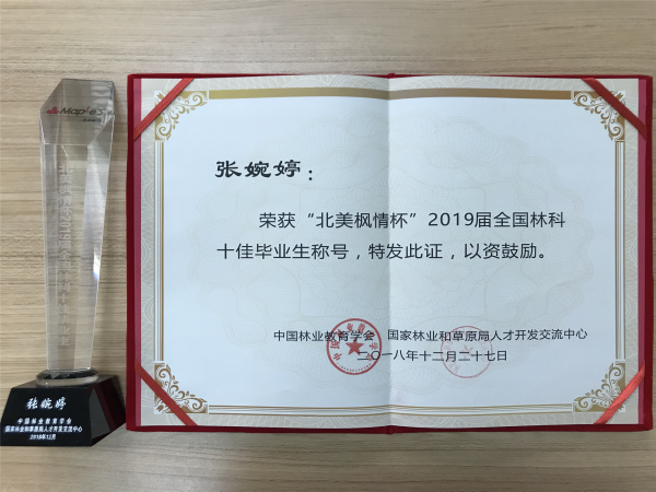 近日,由中国林业教育学会、国家林业和草原局人才开发交流中心主办的“北美枫情杯”2019届全国林科十佳毕业生评选活动颁奖典礼在安徽农业大学举行。德赢官网共有11名同学从全国300多所涉林院校415名候选人脱颖而出,获奖人数在所有参评高校和科研院所中位列第2。