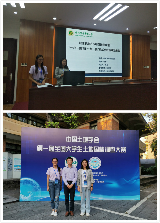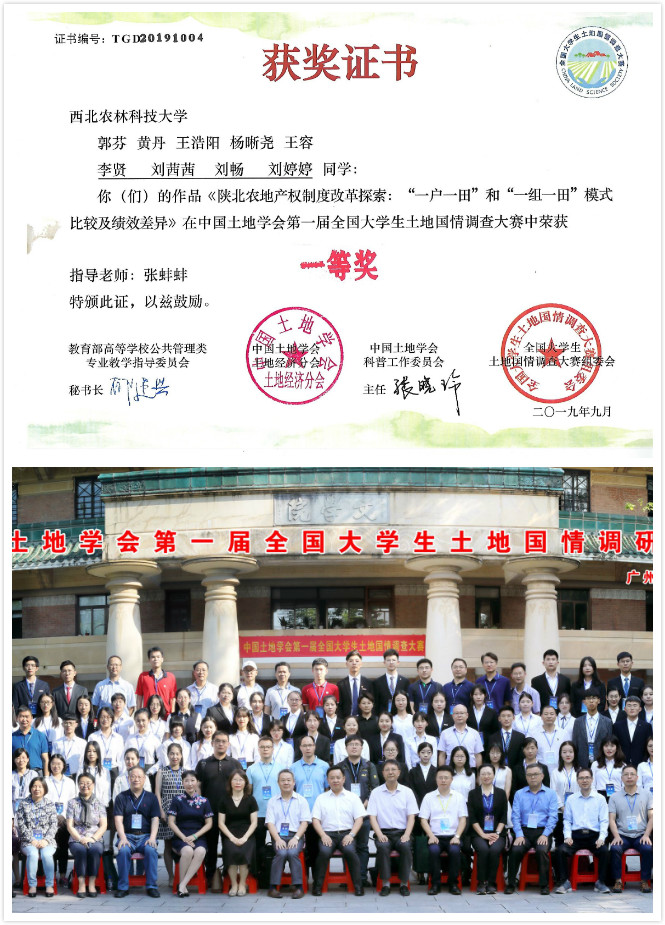 德赢官网土地资源管理专业2017级本科生郭芬、黄丹等领衔的行者团队在德赢官网青年教师张蚌蚌博士指导下,以“陕北农地产权制度改革探索:“一户一田”和“一组一田”模式比较及绩效差异”参赛作品入围决赛并荣获一等奖(奖金5000元)。该奖项的获得,有效锻炼了本科生的探索和研究能力,显著促进本科生加强专业课程学习并学以致用。队长郭芬感言,从确定题目、到问卷设计、到报告撰写,一次次的修改和制作PPT,多次的演练,成绩的取的离不开指导教师和陈海滨老师的悉心指导,感谢学院提供的平台。指导老师张蚌蚌说,“能够与东道主华南理工大学代表队,南京大学和浙江大学代表队共同获得一等奖,提升了德赢官网在同行中的声誉;体现了本科生的卓越创新能力,培养了学生的爱国和恋土情怀,激发了学生探索认知祖国土地的激情”。