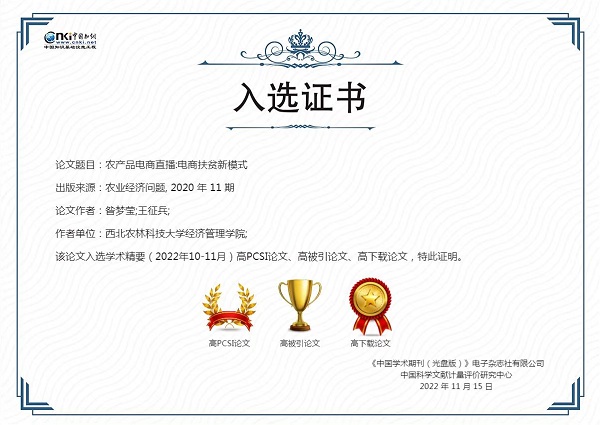 近日,由中国农业科学院农业经济与发展研究所、中国农业经济学会、中国农业技术经济学会主办,农业经济问题杂志社承办的第三届“中国农业经济与产业发展(海南)大会”在海口市成功举办。大会发布了《农业技术经济》创刊40年最具影响力十佳作者、最具影响力十佳论文以及《农业经济问题》2019-2022年十佳论文,德赢官网王征兵教授团队撰写的《农产品电商直播:电商扶贫新模式》榜获得《农业经济问题》2019-2022年十佳论文。