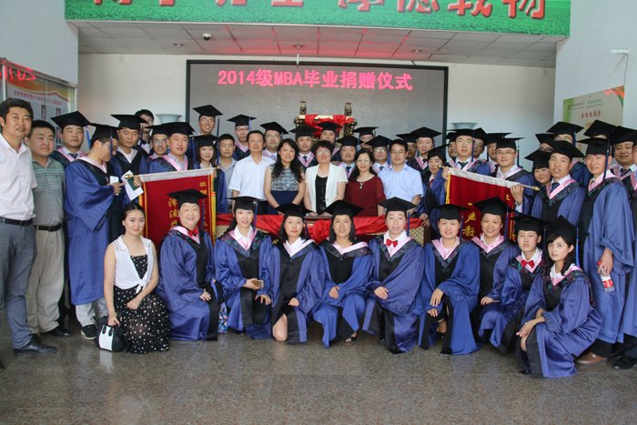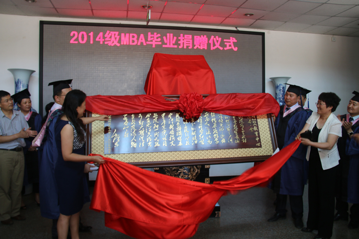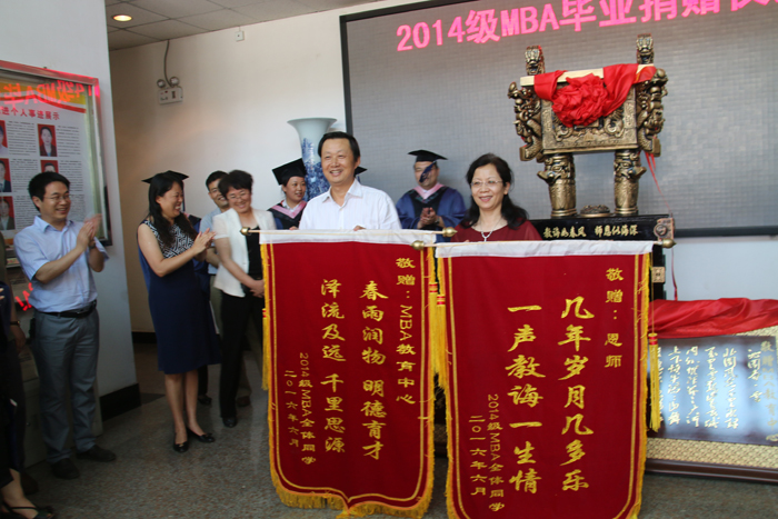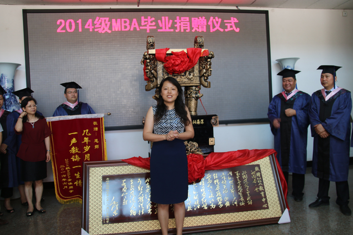 德赢官网2016届MBA毕业生带着一份真挚的感情,感恩母校、爱心捐赠。活动在欢快而又热烈的气氛中拉开了序幕,仪式由第二届MBA联合会副主席宋博主持,主席刘云涛首先代表全体同学发表了感想,表达了对学校、学院培养的感激、感恩和不舍之情。MBA教育中心主任赵敏娟、党委书记姚晓霞为捐赠纪念品揭幕。随着一席红布的落地,一尊气势不凡的“千秋鼎盛”大鼎和牌匾映入了大家的眼帘。这尊大鼎和牌匾表达了毕业生们对学院的感激之情,也表达了他们对学校和老师“桃李满天下、学子遍中华”的祝福和祝愿。随后,MBA教育中心常务副主任孟全省、MBA导师代表孔荣接受学生代表李艳梅、岳桂香向MBA教育中心、老师赠送的锦旗。