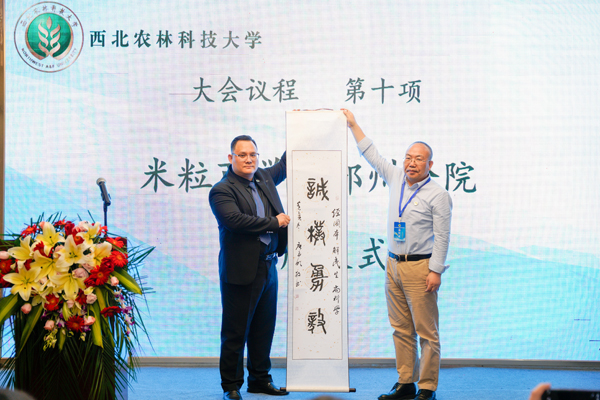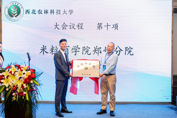 西北农林科技大学校友工作办公室主任、教育发展基金会副理事长兼秘书长王吉成现场宣读《关于同意成立西北农林科技大学河南MBA校友会的批复》,宣布西北农林科技大学河南MBA校友会正式成立。河南MBA校友会筹备组执行组长韩祥军向大会汇报了筹建工作。他谈到了几个热血校友在正月初五说干就干,只为搭建一个校友联合、行业联合、资讯互通的校友共同发展的平台;谈到了夏显力院长在筹建之初给予的“先建立、后完善”的鼓励;谈到了大家默契配合,不辞辛苦,出钱、出力、出物、出人的“尽我所能”。一切都是为了“凝聚西农河南 MBA 校友力量、躬耕中原大地、致力行业振兴”初衷。在主持人马怡博、刘浩旭主持下,大会审议表决并通过了《西北农林科技大学河南MBA校友会章程》和西北农林科技大学河南 MBA 校友会第一届理事会人选名单。王吉成主任、夏显力院长分别向河南MBA校友会授旗、揭牌,并赠送了具有特殊意义的西北农林科技大学建校第一高楼奠基砖—“农专”拓片。两个初创带着同样的初衷跨越近90年不期而遇!
