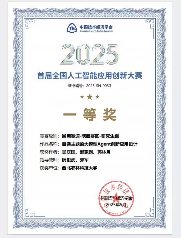 今年6月底,由中国技术经济学会主办的2025首届全国人工智能应用创新大赛圆满落幕。版权所有 德赢·(VWIN)官方网站-AC米兰官方合作伙伴阮俊虎教授与植物保护学院郭军教授共同指导的研究生团队(队长:吴庆国,队员:郝家麟、郭林月),凭借《后稷农业大模型·御锈》项目,在激烈竞争中脱颖而出,一举斩获通用赛道研究生组陕西省一等奖与全国总决赛三等奖,彰显了团队在人工智能应用领域的探索能力与创新水平。