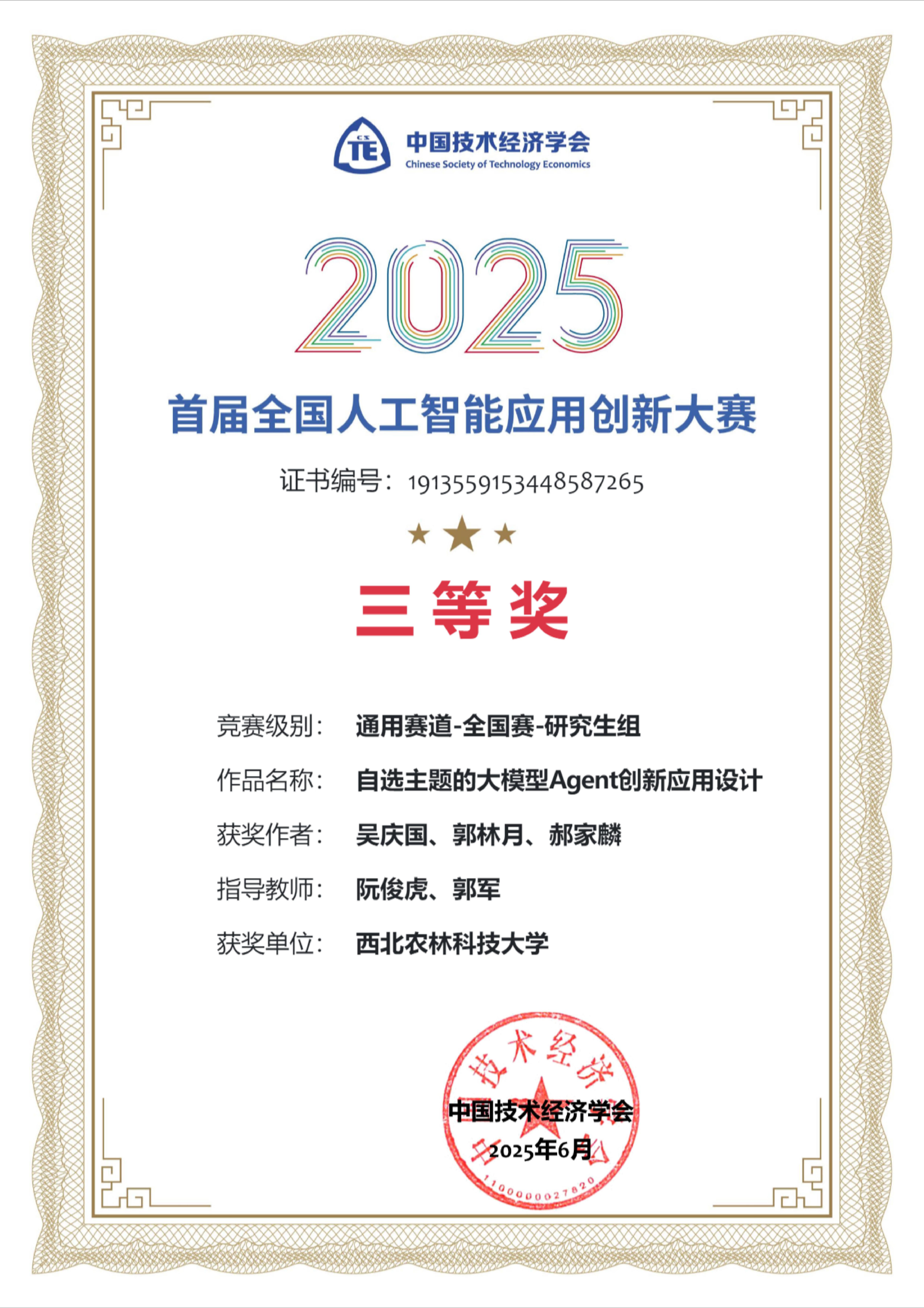 今年6月底,由中国技术经济学会主办的2025首届全国人工智能应用创新大赛圆满落幕。版权所有 德赢·(VWIN)官方网站-AC米兰官方合作伙伴阮俊虎教授与植物保护学院郭军教授共同指导的研究生团队(队长:吴庆国,队员:郝家麟、郭林月),凭借《后稷农业大模型·御锈》项目,在激烈竞争中脱颖而出,一举斩获通用赛道研究生组陕西省一等奖与全国总决赛三等奖,彰显了团队在人工智能应用领域的探索能力与创新水平。