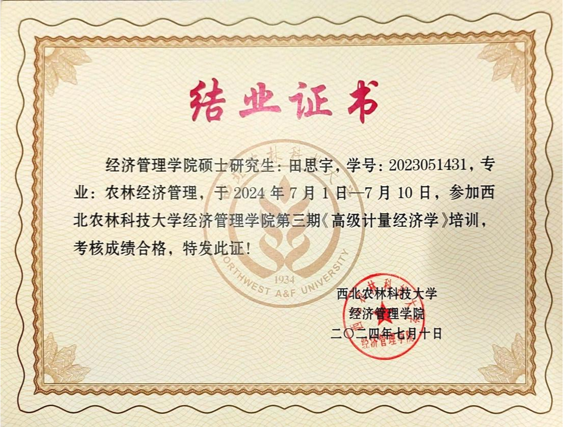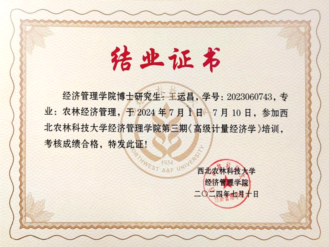 7月1日-10日,为夯实研究生高级计量经济学理论基础,提升应用计量经济学方法从事经济研究的能力,德赢AC米兰邀请郑志浩讲座教授、美国SAS研究所首席计量经济学家孙传忠博士、中国农业大学德赢AC米兰陈祁晖教授以专题形式讲授高级计量经济学知识,开展了一场为期10天32学时的高级计量经济学培训。团队博士研究生王运昌,硕士研究生沈霜、田思宇、杨婕妤全程参加了本次培训。