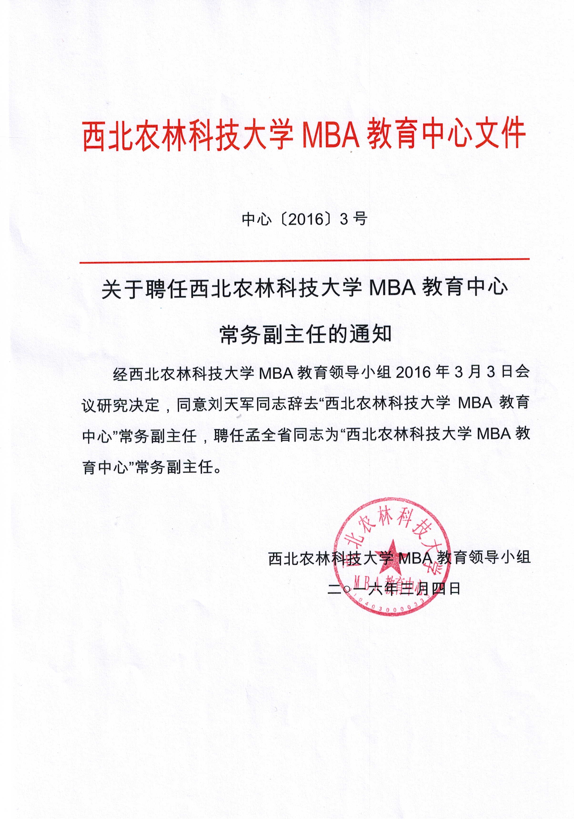 关于聘任西北农林科技大学MBA教育中心常务副主任的通知