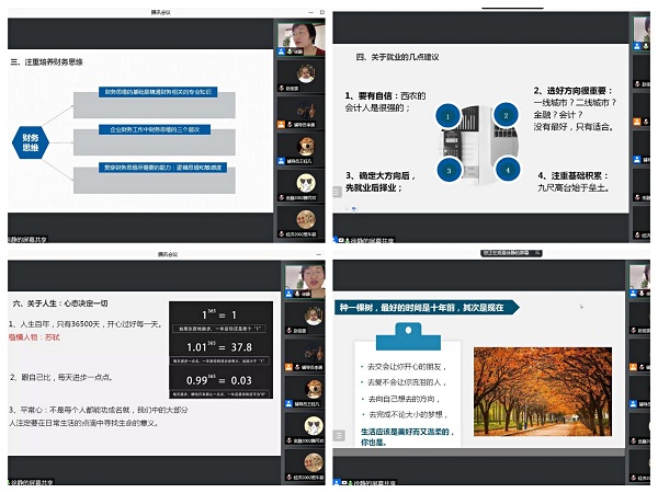 徐静从就业选择的“岔路口”、证书考取与继续教育、财务思维培养以及就业的几点建议等四个方面为同学们带来了一场精彩纷呈的讲座。围绕自身经历为同学们详细地分析了进入企业就业、升学与出国深造、考取公务员等各种就业选择的权衡,鼓励同学们发现自我明晰就业方向,切勿“盲目跟风”,勉励同学们“要增强自信、注重基础积累,在踏上工作岗位之后,需要保持虚心学习的态度,提升一级思考,降低一级做事,要保持良好的心态,每天进步一小步。”