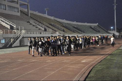 在热火朝天的训练中,每个参训队员的冬训关键词是五花八门不一而足,在这里我们只说其中的三个。郭帅同学感觉参加冬训很累但是很充实,那种汗水打到地上的能让他很明确地感受到自己的存在。他还表示十圈的运动量有一点点低并且建议可以循序渐进加到二十圈甚至更多,这样或许能够起到更好的训练效果。曾辉同学则更偏向于冬训能够让他结交更多的朋友,认识一些志同道合的跑友,那种一起压腿一起拉伸的感情十分坚定。牛文浩同学却为冬训表现出来的坚韧的意志感动,他说长跑是踽踽独行的旅途,没有如钢似铁的意志很难坚持下去,他也希望在冬训结束时自己能收获这种意志。