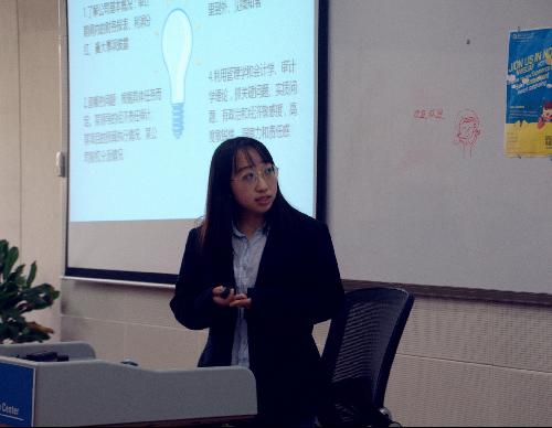 比赛分为简历展示、PPT阐述、评委点评三个环节。下午三点,比赛准时开始,在主持人精彩的开场白之后,选手们轮番上场进行自我展示。每位参赛同学首先展示了自己原创的简历作品,同时通过精彩的演说和PPT向大家展示自己的设计。在每一位参赛选手个人展示结束后,两位老师分别进行点评指导。比赛中还穿插了两轮关于就业与简历的知识竞答小游戏,在主持人与同学们的热情互动中,现场的气氛十分高涨。