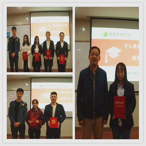 比赛最后,辅导员梁子龙指出,简历应该简洁明了,用较为具体的数据表达叙述自己的实践经历及个人成绩,针对不同公司的不同岗位投递具有针对性的简历。辅导员吴春生针对简历的结构内容进行了系统的讲解,告诉大家制作简历时应该注意的细节和一些设计及技巧,同学们感触良多,受益匪浅。最终,通过评分, 2017级农林经济管理专业薛文田同学荣获本次大赛一等奖,评委老师为所有获奖的同学们颁奖并合影留念。