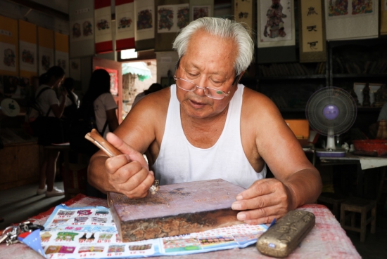 朱仙镇木版年画大师张继中在采访中讲到,1992年,他开始接触和学习这门手艺,在这将近三十年里,他在自己的实践和打拼中为朱仙镇谋划出路。张继中先生是朱仙镇万同老店木版年画作坊的第六代传承人,万同老店年画作坊从事年画生产已有近400年的历史,而今天的他也拥有与年画和民间艺术有关的诸多头衔。其父亲年画老艺人张连生也是将匠心发挥到了极致。调研队赶到时,老人在中午烈日当头之际仍然做着自己的工作,没有电扇和空调消暑,每天工作十几个小时,70多岁,头发花白,却毫不懈怠。正是由于这些大国工匠的精雕细琢,无私付出,中国的文化才能传承至今,亘古不变。