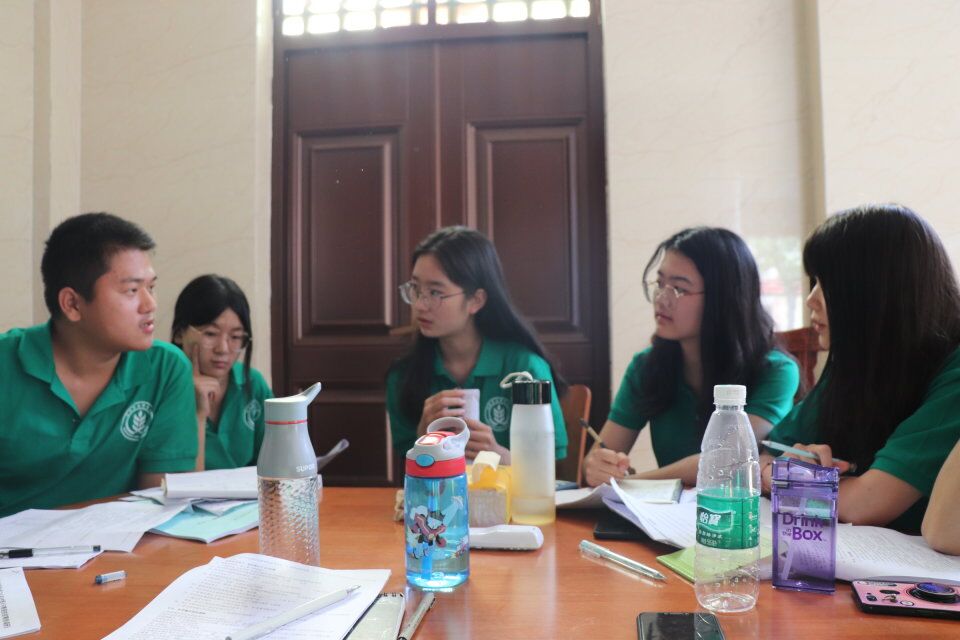 在结束午饭和午休后,队员们又集合起来,开始对中午调研成果的讨论总结。各个小组依次对中午了解到的本乡的基本情况做了汇报。一份份的调研问卷经过全队的对比反思,反应出当地近年来产业发展的大致态势和扶贫工作成果。同时,一些当地发展中存在的问题也逐渐浮现。