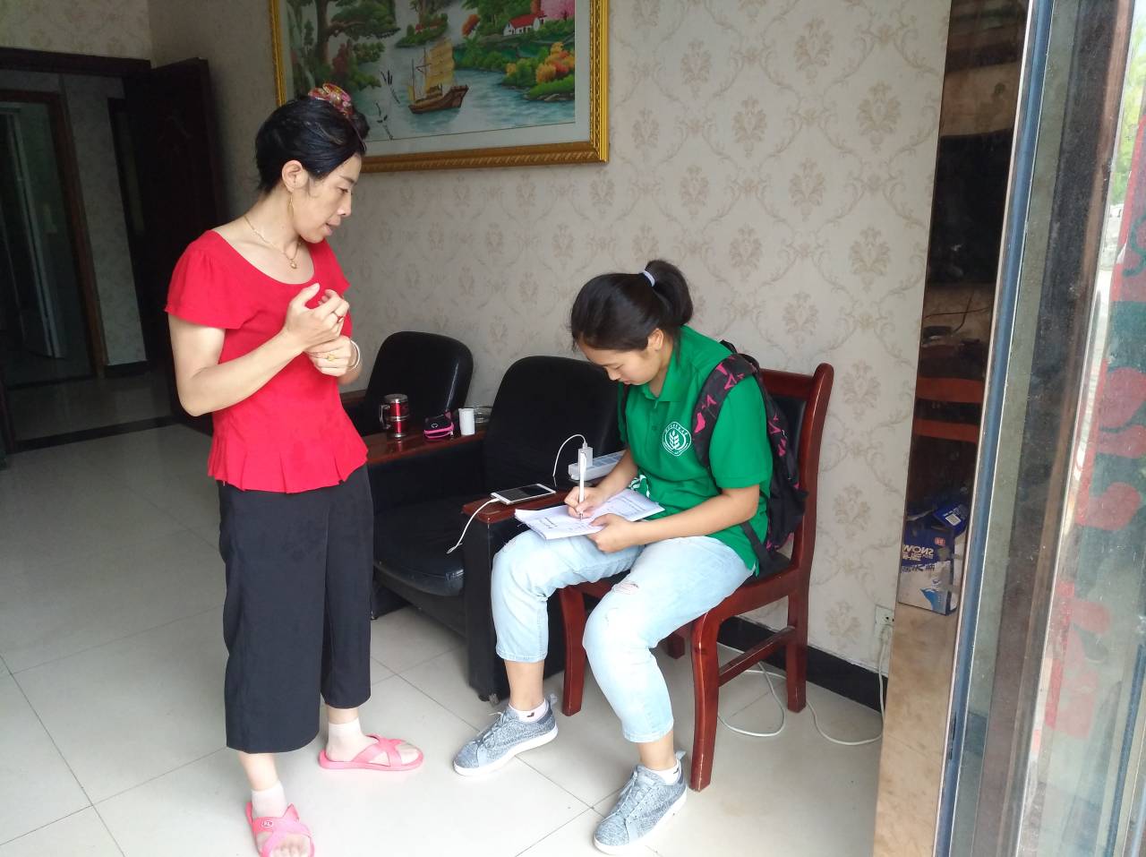 当地的住户都非常热情友善,积极配合队员开展调查。他们用稍带乡音的方言向队员们详细介绍了村落和家庭的基本情况。队员们了解到大河坝镇的土地大都被收回,农民大多以外出务工为主要收入来源。在此之后,调研队对三河口村的村民进行了问卷调查。队员们沿路看到了很多村民私营的宾馆、饭店。该村村民的收入来源更加多元化,以外出打工、经商为主。
