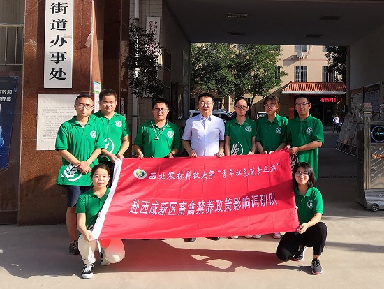 炎炎夏日的西咸新区里,或在村庄小路上,或在泥泞小道上,都能看到一小队不畏烈日身穿绿色T恤的调研者。他们便是赴西咸新区畜禽养殖政策影响调研队。8月2日,队员们出发前往沣西新城高桥街道的沙河村进行调研。