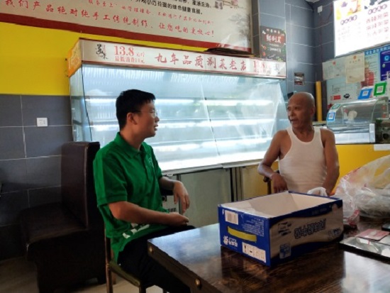 队员史帅旗在与老城区街道旁的商铺里的店主交谈