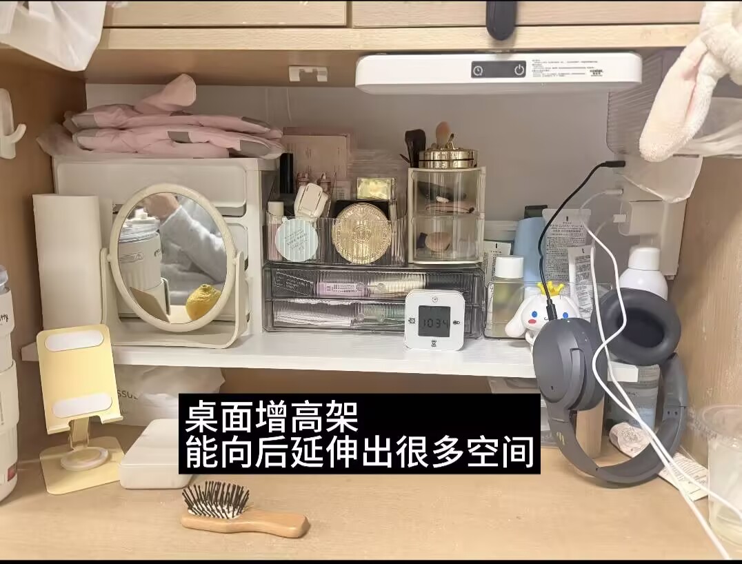 此外,同学们还分享了一些极具创意的收纳方案,比如在床板缝隙中卡住的四层架子,充分利用了床与桌面之间的空间,既不会阻碍平时的取用,又能收纳大量物品;下铺的衣服挂钩则以其便捷的使用方式,让杂乱的衣物变得整洁,随手一挂即可,随用随取,质感与美观兼具。