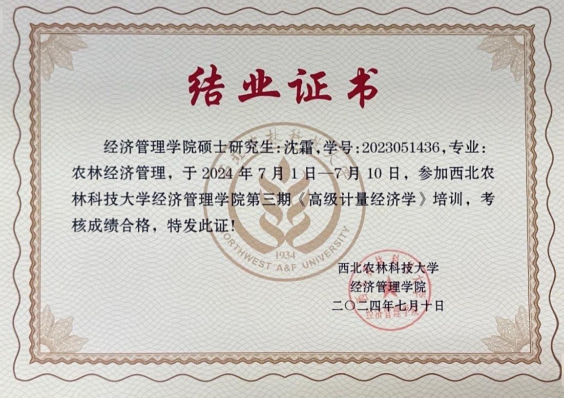 7月1日-10日,为夯实研究生高级计量经济学理论基础,提升应用计量经济学方法从事经济研究的能力,德赢AC米兰邀请郑志浩讲座教授、美国SAS研究所首席计量经济学家孙传忠博士、中国农业大学德赢AC米兰陈祁晖教授以专题形式讲授高级计量经济学知识,开展了一场为期10天32学时的高级计量经济学培训。团队博士研究生王运昌,硕士研究生沈霜、田思宇、杨婕妤全程参加了本次培训。