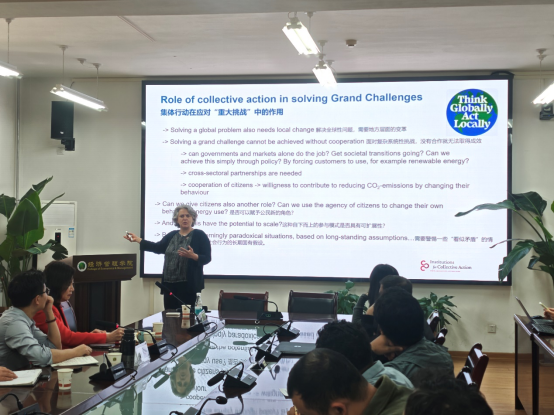 Tine De Moor教授以“历史为何对当今基于社区的解决方案如此重要:西欧公共资源治理的历史脉络和现实启示”为题揭示了集体行动在解决公地治理等全球性挑战中的核心作用,指出历史经验表明自下而上的社区自治、资源多样性和多中心治理是制度韧性的关键。通过对西欧公地制度千年演变的分析,研究提出了“适度自治+多样化资源”的可持续发展模式,为现代能源转型和社会治理提供了借鉴。讲座特别强调,将公民转化为“产消者”的参与式治理,以及跨部门协作的网络化策略,是应对气候变化和市场失灵的有效路径。互动环节,Tine De Moor教授与参会师生就现代社区治理、能源转型等多个实际问题进行了深入讨论,与会师生纷纷表示本次报告受益匪浅。