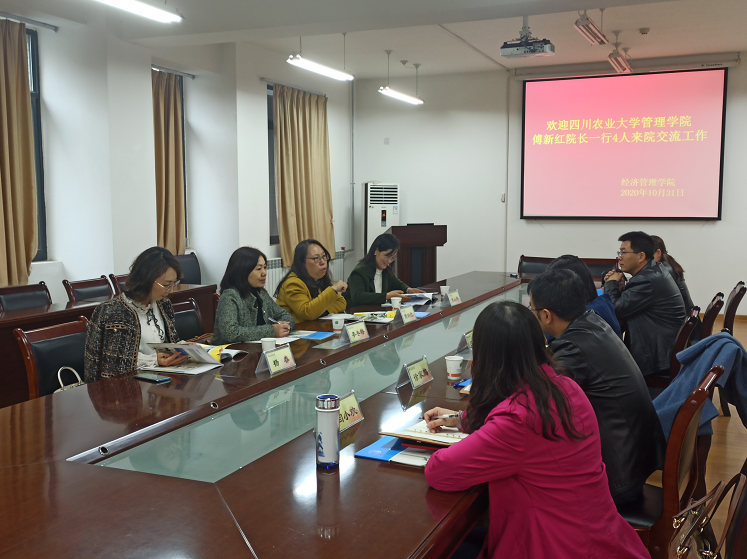 10月31日下午,四川农业大学管理学院院长傅新红教授、副院长李冬梅教授、农经系系主任张社梅、副系主任杨春一行四人到访德赢官网,双方就本科教学的组织与管理工作及绩效改革、农林经济管理国家一流专业建设、实验室及校外实习基地建设、专业核心课程教学及实验教学、学科与团队建设、研究生招生与培养等方面进行座谈。学院副院长汪红梅教授、农经系主任赵凯教授、杜君楠副教授、闫小欢副教授、徐家鹏副教授等人员参加座谈会。