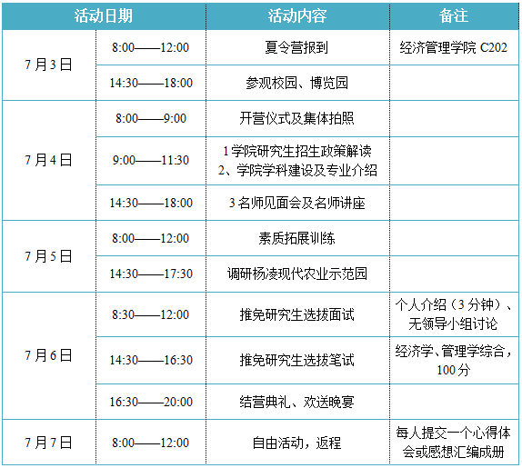 2.请提前到达与推迟离开的学员自行解决在杨凌的各项事宜;学员报到后要求全程参加夏令营活动。