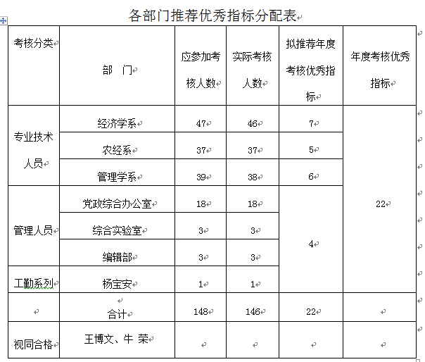 (三)考核等级分为优秀、合格、不合格三类。考核为“优秀”人员数,严格控制在实际参加考核人数的15%(各部门具体指标见附表),各部门推荐的年度考核为优秀的教职工,应该在各个方面比较突出,具有很强的代表性,确实是全院教职工学习的模范。