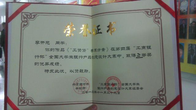 11月29日,由共青团中央学校部、中国工商银行、对外经济贸易大学联合主办的第四届“工商银行杯”全国大学生银行产品创意设计大赛全国总决赛在北京对外经济贸易大学隆重举行,德赢官网2011级金融学专业李开元同学表现突出,荣获总决赛三等奖的好成绩。