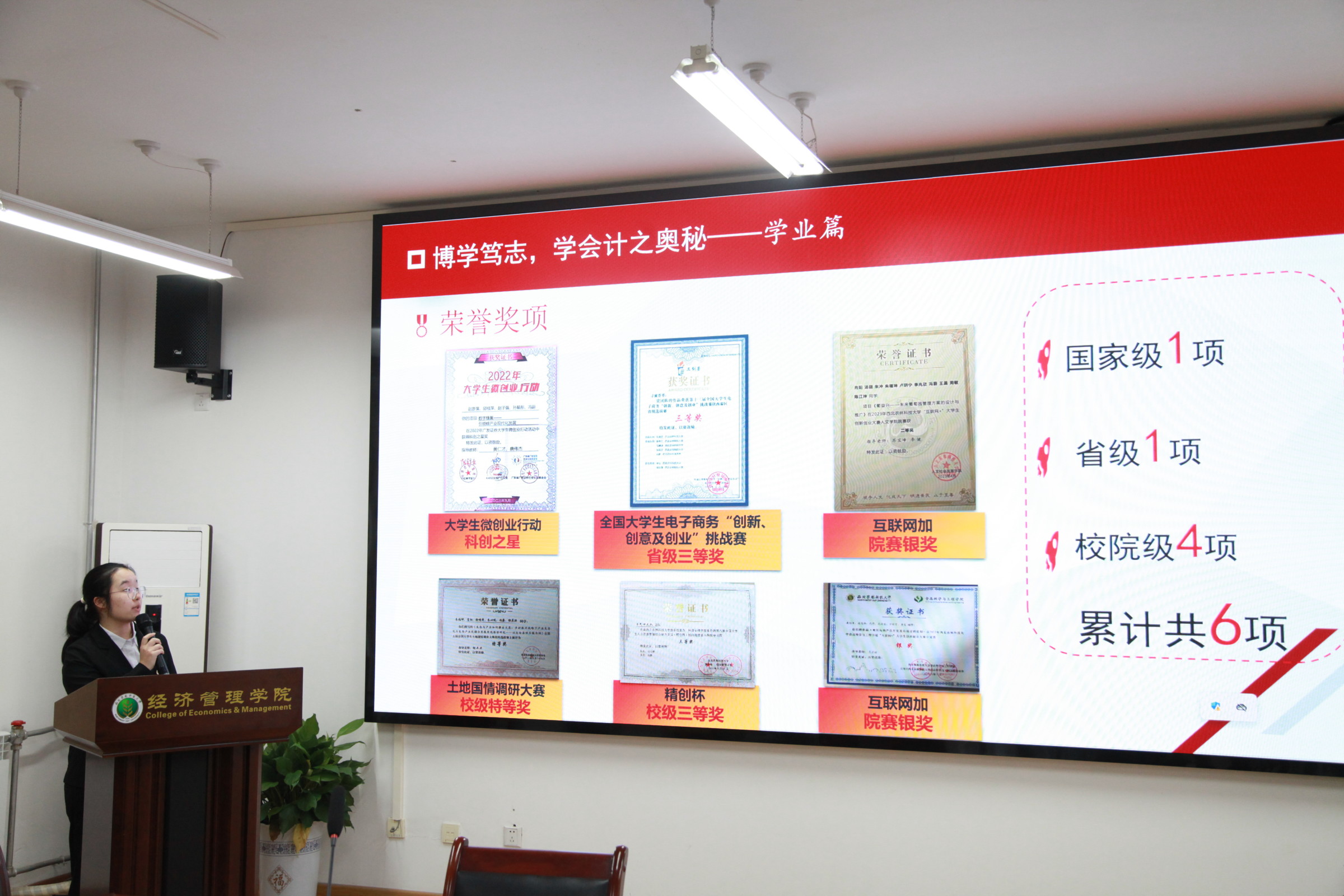 此次评选答辩展示分为个人陈述环节和评委提问环节,候选人们讲述了他们的大学生活:从加权成绩到奖项荣誉,从学生工作到社会实践,从享受生活到服务社会.....金融2102班的郭楠,23门课程中20门课程绩点满分,共获得了4项国家级荣誉,5项省级荣誉,19项校级荣誉,她还是一位热心服务的学生干部,担任校团委创新创业部副部长,班级班长及班主任助理,组织策划多场活动,她以兴农勇毅解民生为目标,争做青春助农实干家。