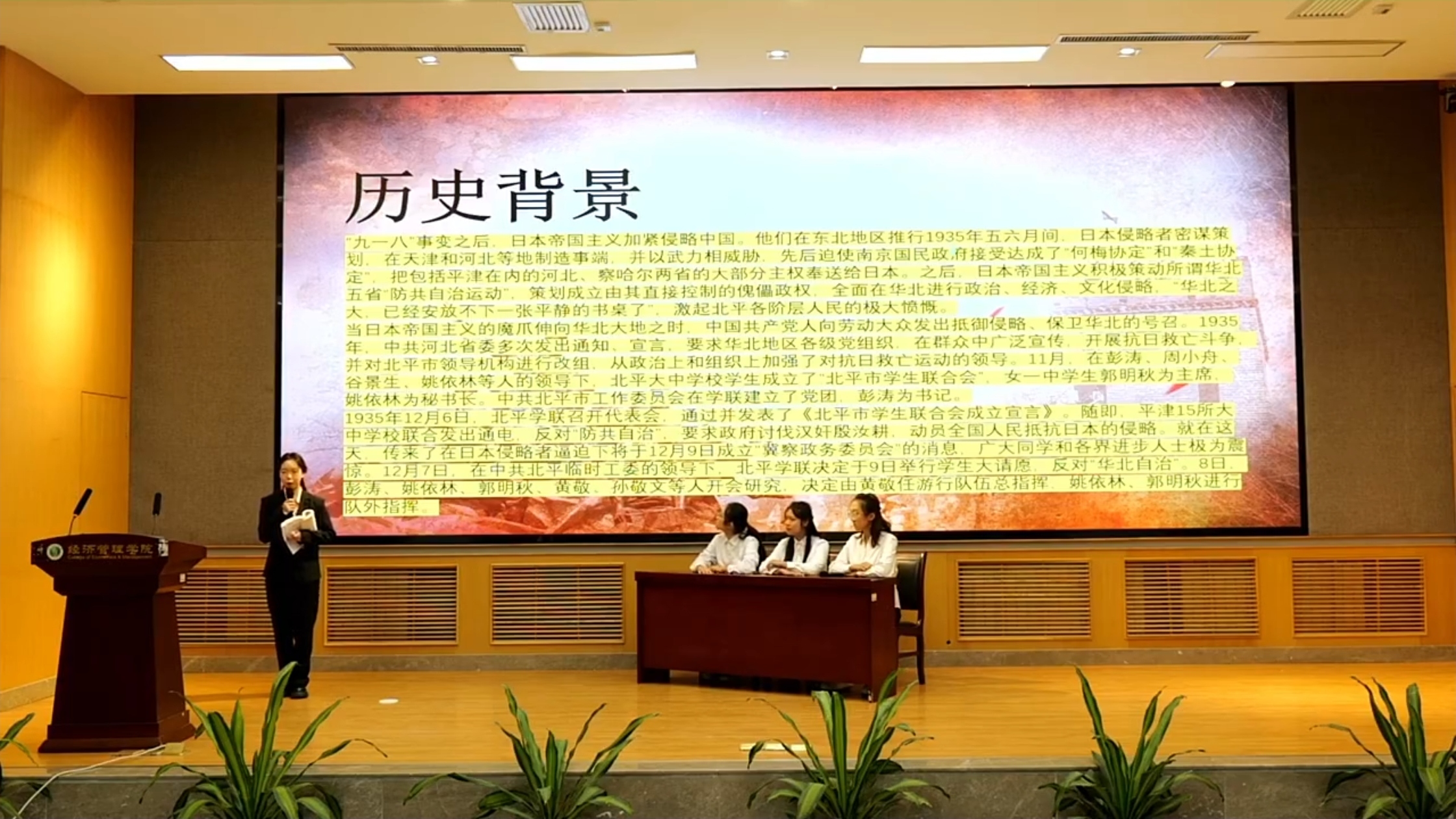 接下来,学习以创新的表演形式开展。情景演绎以1935年的北平街头为背景,通过学生们的深情表演再现了爱国青年集会、请愿的历史场景,令人仿佛回到了那个热血激昂的年代。接着的诗歌朗诵环节,将爱国情怀与青年担当表达得淋漓尽致。整场表演高潮迭起,在场师生深受感染。