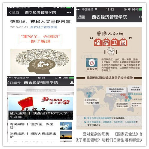 在活动期间,通过学院微信公众号(xnjgxy)、校园网站等各种形式促使同学们了解国家安全教育日的来历以及重要性,懂得“国安民安家才安,有你有我才有国安”的道理。同时采取微信知识问答的形式,加强互动,吸引学生对《国家安全法》涉及的领域、《国家安全法》与我们日常生活的关联、如何反间谍等内容的关注与学习,提升国家安全意识,激发爱国主义情怀。