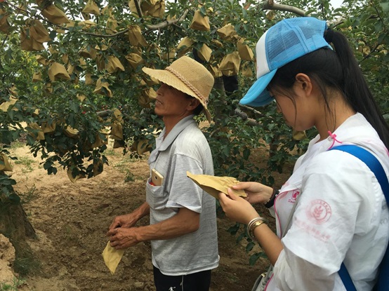 村民屈师傅带着我们去到自己果园,亲自示范并热心讲解苹果套袋的注意事项,也让我们体验了一回苹果种植中的中间管理环节,访谈在轻松愉悦的氛围下顺利展开。屈师傅谈到:“农民跟不上科技的发展,如果不按照政府技术人员说的做,是种不出好苹果的,非常感谢试验站为我们提供的技术,苹果收成很好。”