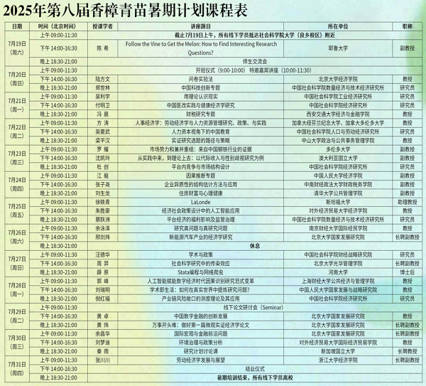 第八届香樟青苗计划主办方邀请了陈希、刘梦迪、梁平汉、刘瑞明、冯晨、徐轶青等“香樟经济学术圈”海内外优秀青年学者就经济学专题研究、计量经济学方法、中国问题研究、中英学术论文写作训练、STATA和爬虫工具等内容开展讲座;邀请往期优秀学员分享学习心得和研究经验;邀请老师对学员的论文和汇报进行点评,共计安排相关讲座和讨论32场次。