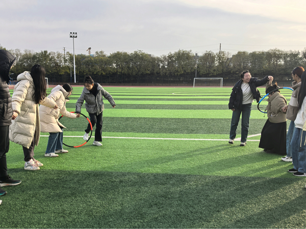 本次活动聚焦“考前减压”,分为两个模块:“一穿到底”和“借花献佛”。在“一穿到底”小游戏里,13位同学被分为两组,手拉手,用呼啦圈穿过所有人的身体回到原位。游戏采用了两种形式,一种是两组同学各拍成一排进行速度比拼,看哪一组率先完成;另一种是所有同学围成一个圈,呼啦圈穿过所有人的身体完成一周。同学们在这个游戏中,既放松了自己的身心,又加强了与同伴之间的沟通,在游戏中释放了自己的压力。