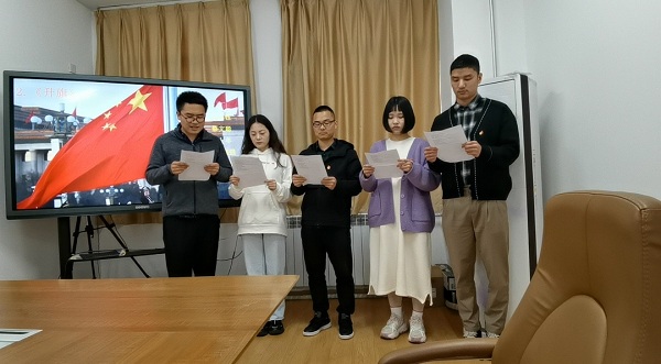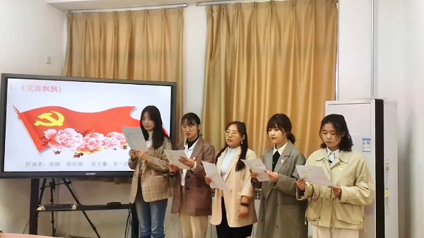 本次诗歌朗诵以“学党史 践初心 启征程”为主题,支部成员以小组为单位进行了展示。各小组依次朗诵《党旗飘飘》、《升旗》和《中国红》三首红色诗歌。伴着婉转的旋律,和着铿锵有力的节拍,各小组成员们声情并茂地朗诵着经典红色诗词,他们用慷慨激昂、精神饱满的朗诵,倾诉着对中国共产党、对祖国母亲的感激和热爱之情,出色的表现赢得了支部成员的热烈掌声。百年党史的一幕幕浮现在我们眼前:鲜红的党旗在飘扬、五星红旗在升起、鲜明亮丽的中国红——红船、红都、红井、红军……