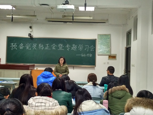 12月20日晚,会计二支部于南校区1213教室召开本学期预备党员转正会议,并且以此为契机开展12月份“做合格党员,发挥党员模范带头作用”专题学习讨论会,会计二支部全体成员与会,会议由支部委员田肖雅主持。