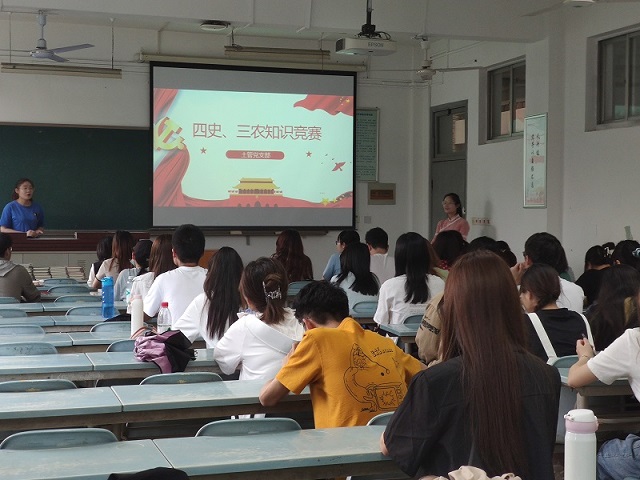 竞赛分为五组,以抢答形式进行,题目类型为单选题、多选题、填空题、判断题,涵盖四史和三农相关知识点。支部全体同志精神饱满,积极举手抢答,现场的比分也你追我赶,氛围格外激烈。